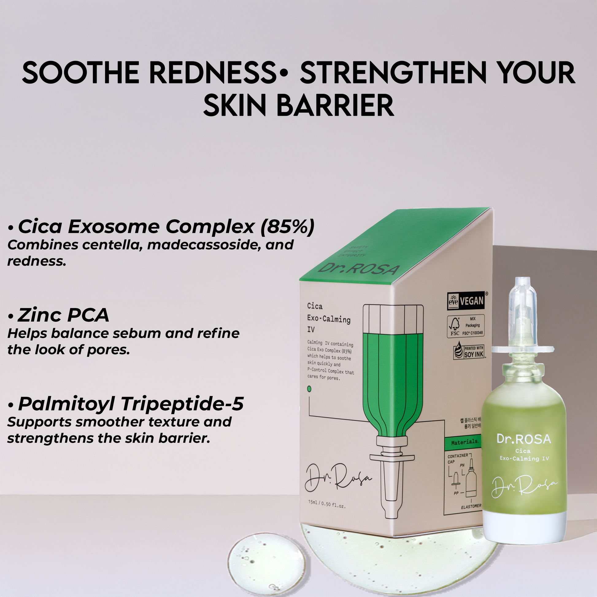DR.ROSA Cica Exo-Calming IV (15 mL) is an intensive soothing serum designed for sensitive and easily irritated skin. This lightweight Korean skincare formula helps calm visible redness, restore comfort, and reinforce the skin barrier using advanced exosome and Cica complex technology.