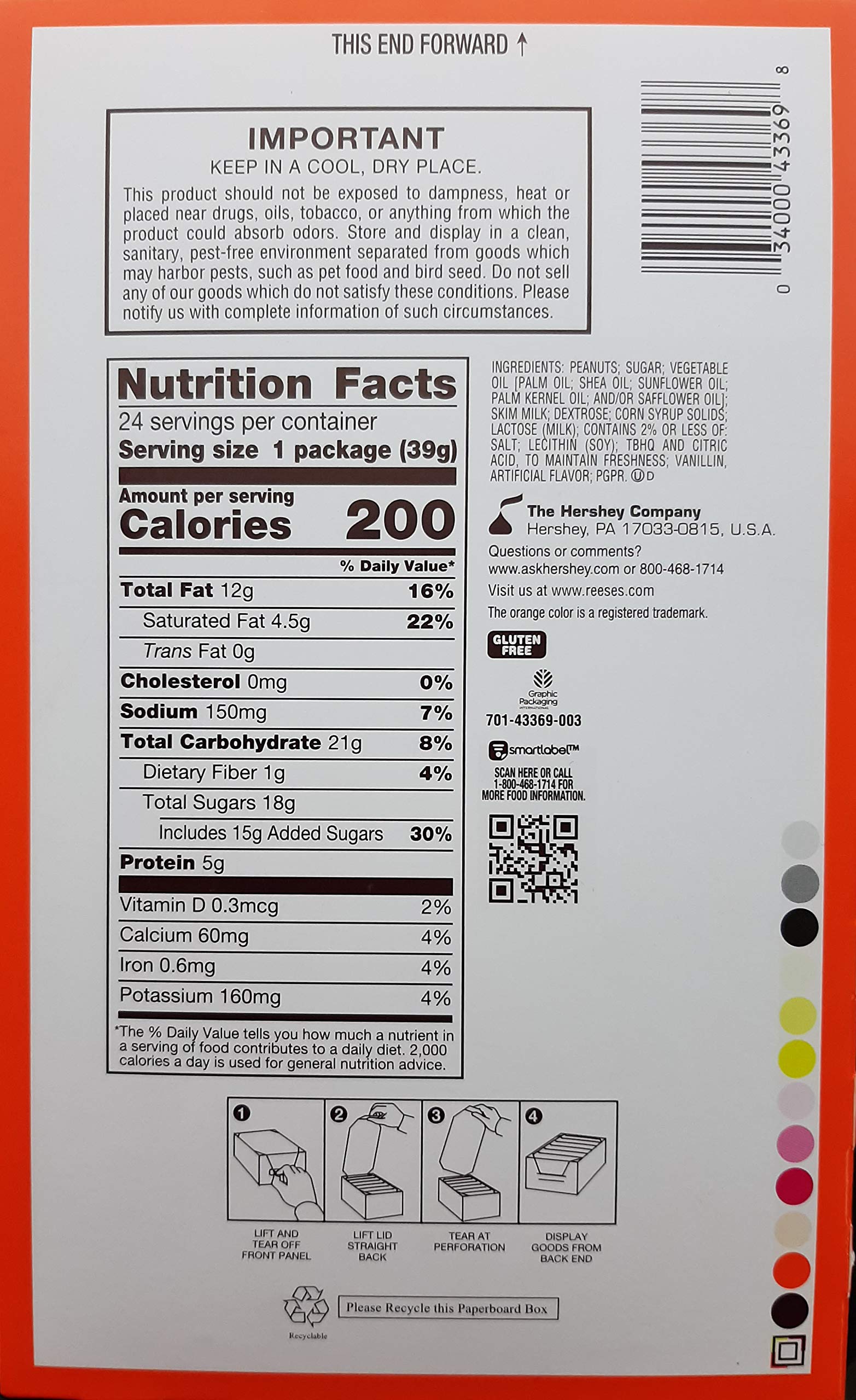 2 white creme and peanut butter cups in each package. 24 packages in one box (24-1.39 oz (39g)/package) NET WT 2LB 1.36OZ(945g)